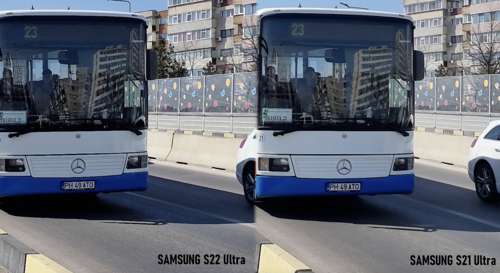 Și o să îți explic de ce spun asta. Avem cadre în care fotografiile sunt destul de asemănătoare la prima vedere, dar când dai zoom pe ele ca în cazul de față se poate observa că negrul este mai negru pe S22 Ultra, detaliile de pe asfalt se văd mai bine, silueta din mijlocul de transport în comun este mai bine definită, iar cifra de pe autobuz este mai clară.