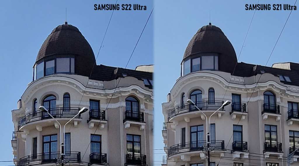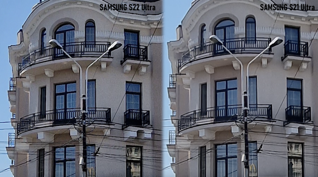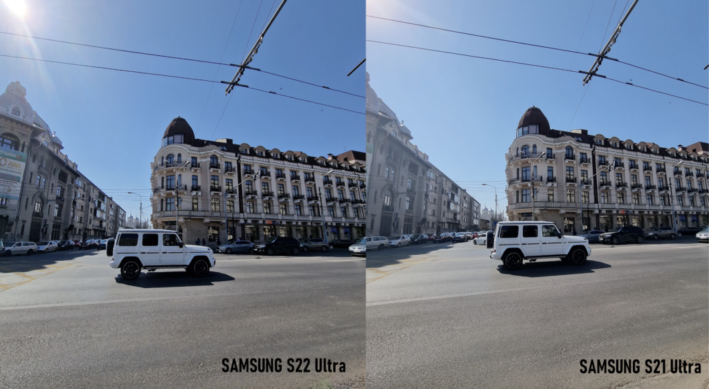Avem un alt exemplu aici, cu soarele în față, în care ambele telefoane se descurcă destul de bine, însă la o privire mai atentă, vedem că S22 Ultra reușește să redea mult mai multe elemente. Clădirea din stânga este mai clară, roata din spate a SUV-ului este mai bine definită, în timp ce pe S21 Ultra se pierde ușor în umbră.