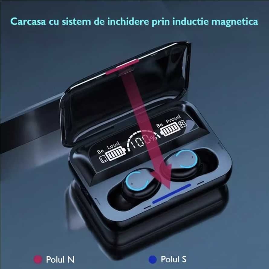 3. Căsti wireless audio, GO4FIT, model GF9-47. Au un design foarte atractiv. Au carcasă magnetică, control prin touch, Bluetooth 5.0, afișaj LED și o autonomie de  până la 20h. Prețul lor este de 79 lei.