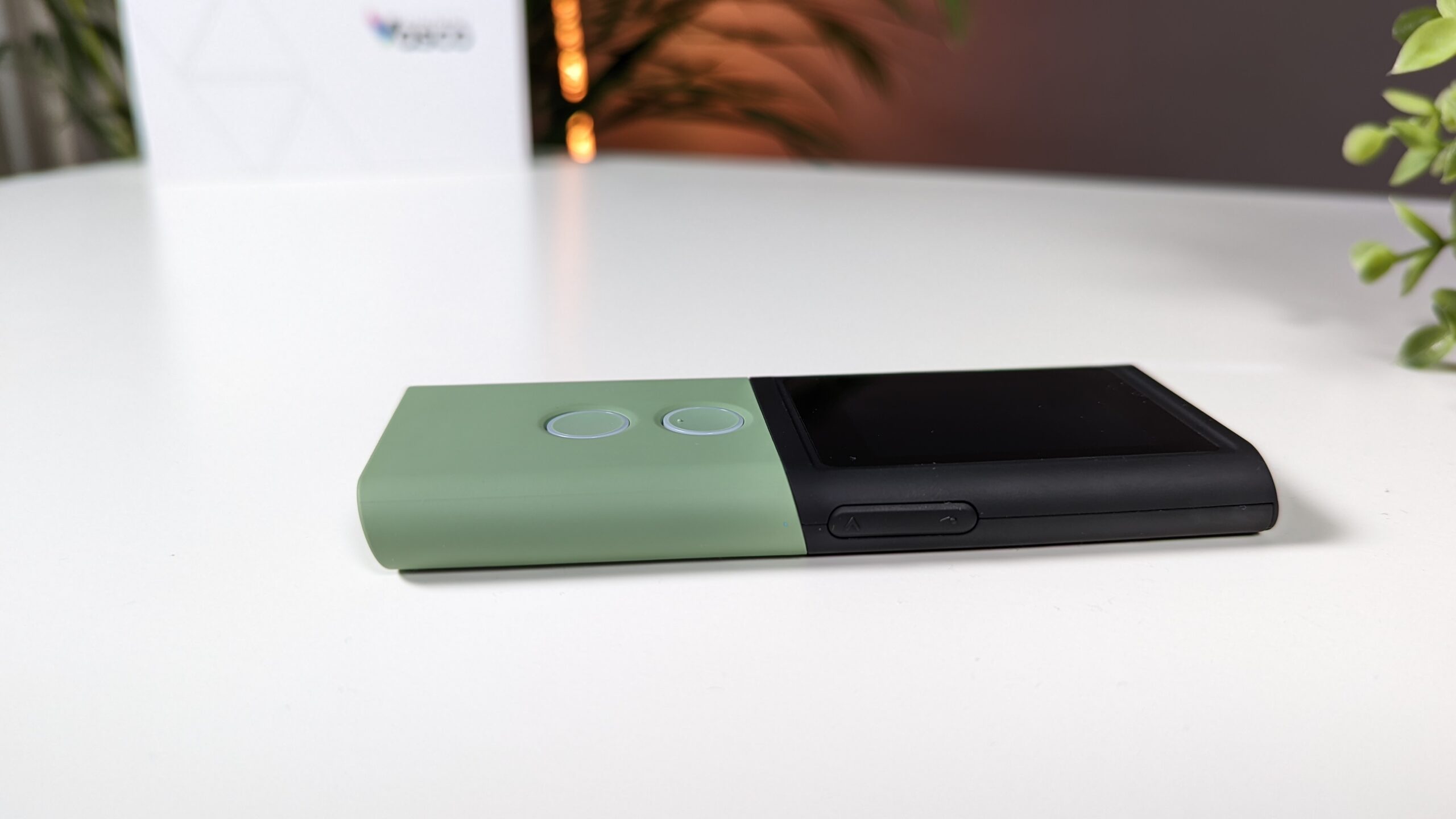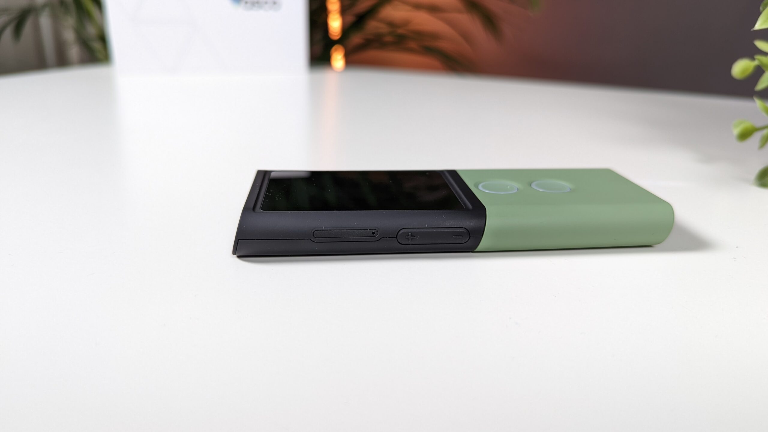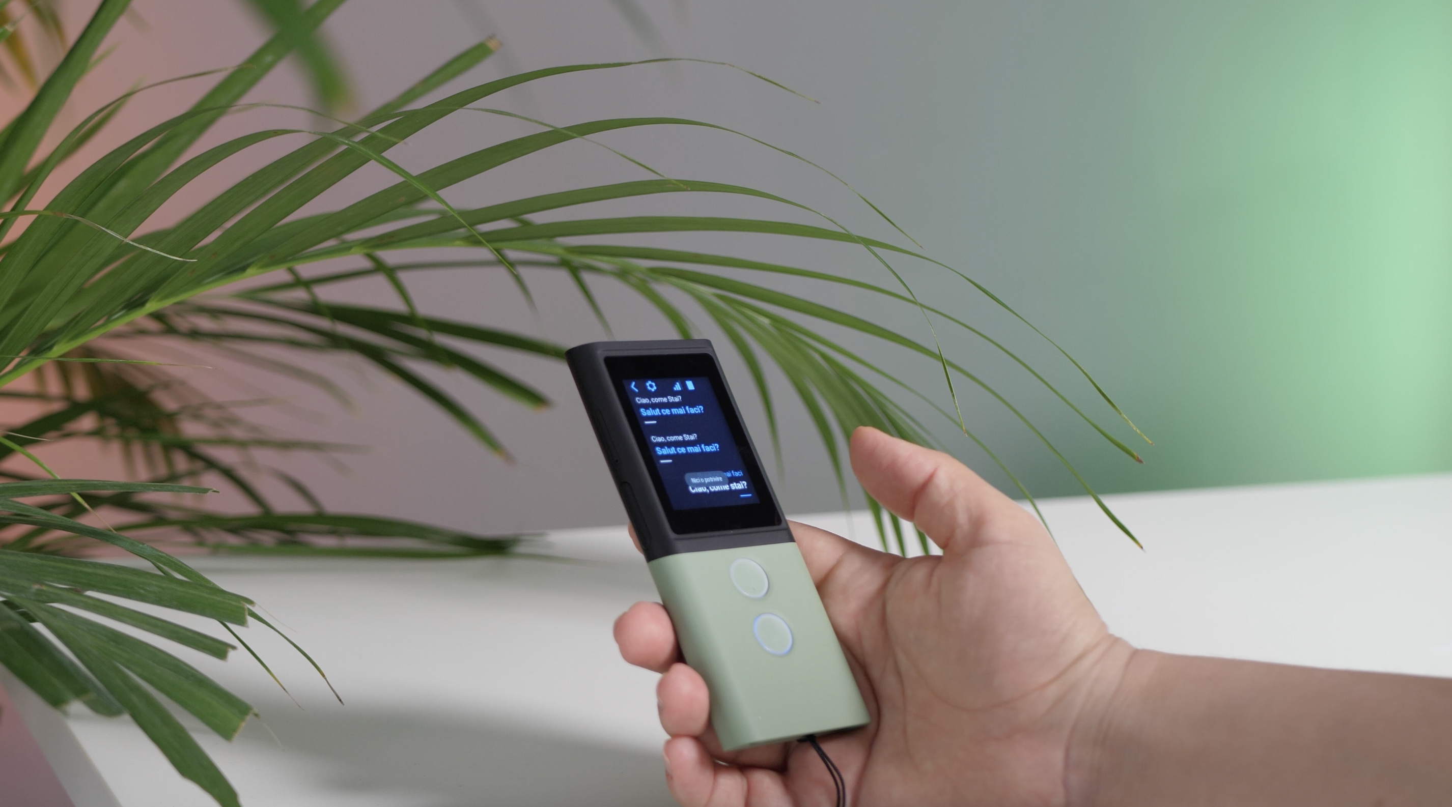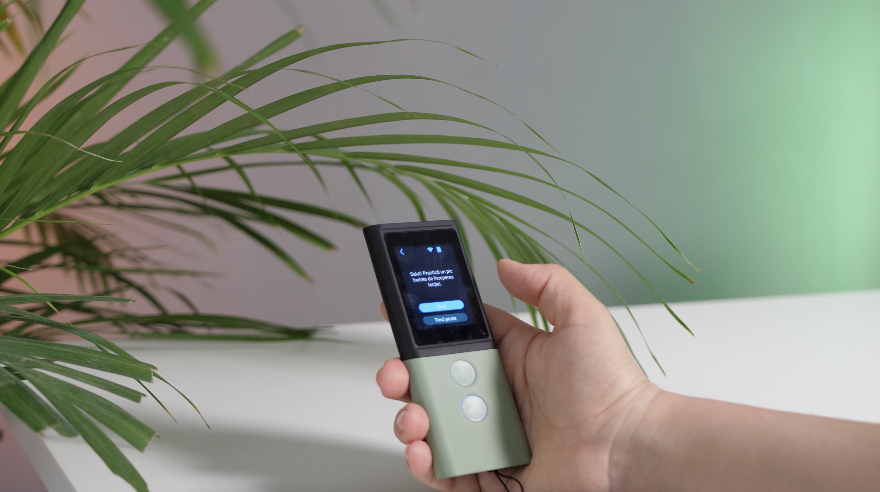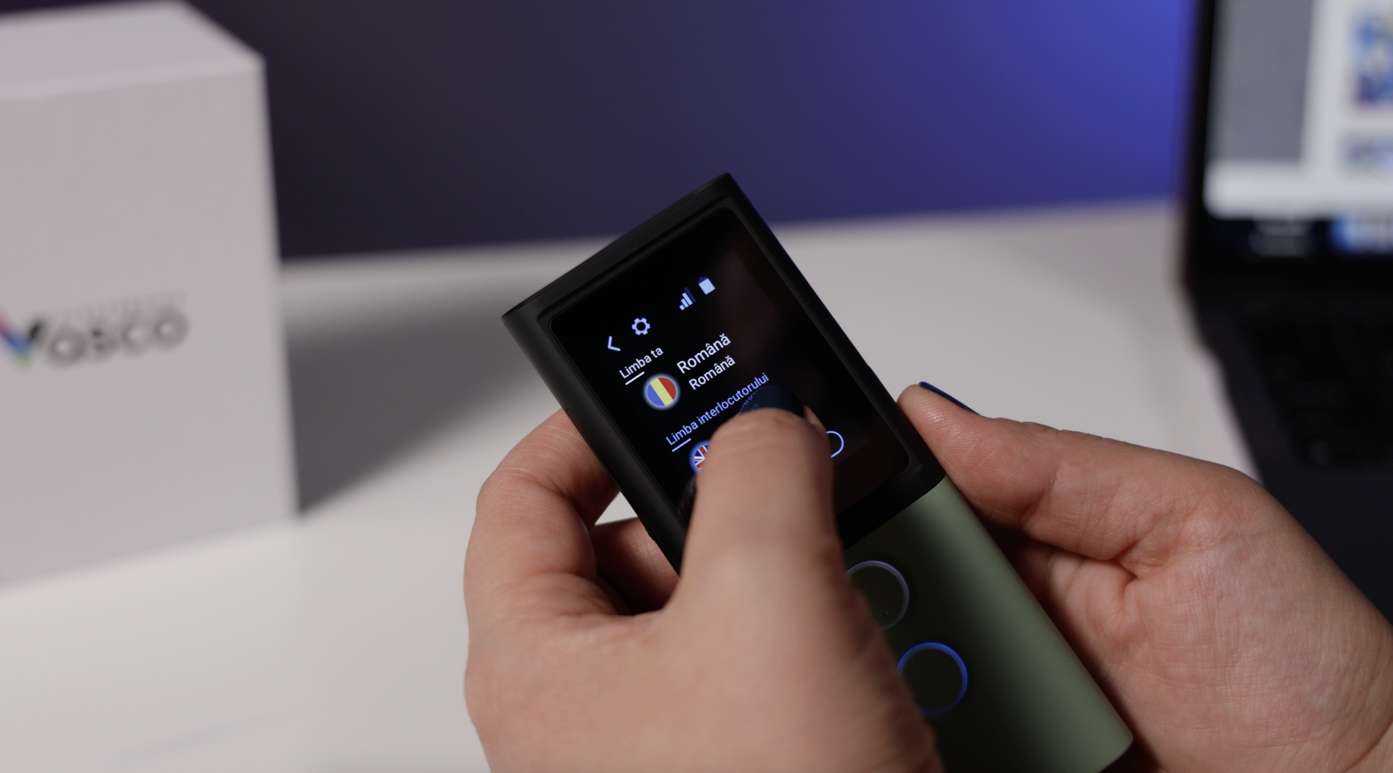Eu am primit la test varianta Green Forest, o nuanță elegantă și foarte plăcută, dar dispozitivul de traducere în timp real mai este disponibil în alte 5 nuanțe: Arctic White, Mint Leaf, Black Pearl, Desert Rose și Blue Ocean. Este un device cu puține butoane, astfel încât să poată fi folosit cu ușurință de orice utilizator. Pe față ai două butoane, care servesc pentru traducere, un microfon pe latura superioară, pe laterala inferioară este găzduit al doilea microfon, ambele cu reducere a zgomotului de fundal, astfel încât să poți folosi translatorul fără probleme chiar și în zonele aglomerate să zicem. În partea de jos mai avem și portul de încărcare USB-C și jack-ul de 3,5 mm pentru căști, pe laterala dreaptă ai butonul on/off și butonul back, pe laterala stângă se regăsesc butoanele pentru volum și sertarul pentru SIM, care vine cu o cartelă SIM cu internet nelimitat pe viață, pentru traduceri, în aproape 200 de țări. Nu vă gândiți că această cartelă poate fi folosită pe telefon, căci ea este configurată pentru a fi folosită doar pe translator.
