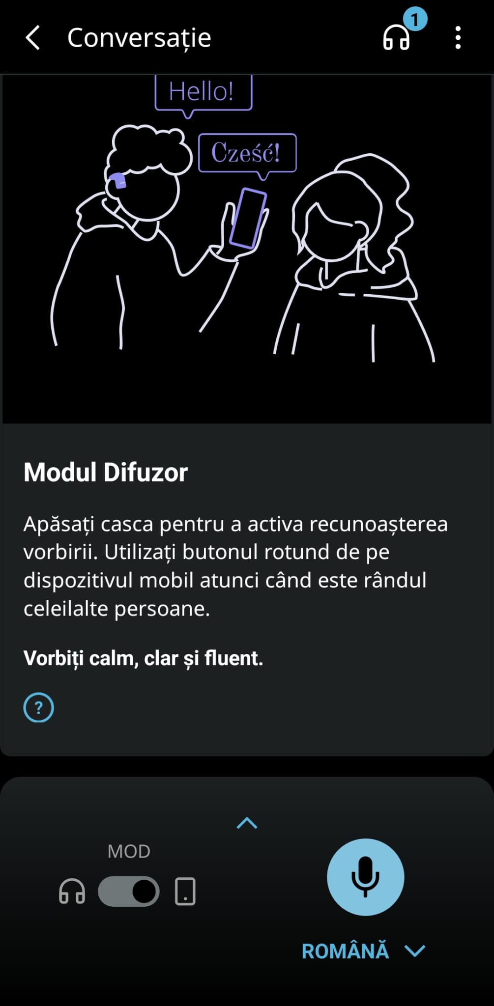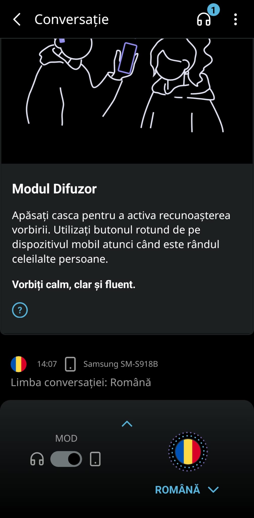 2. Modul Difuzor (Loudspeaker): În situațiile în care interlocutorul nu are acces la o cască, poate utiliza telefonul ca difuzor. Căștile captează discursul și traducerea este redată prin difuzorul telefonului. Acest mod necesită activarea manuală pentru fiecare frază, dar oferă flexibilitate în diverse scenarii de comunicare.