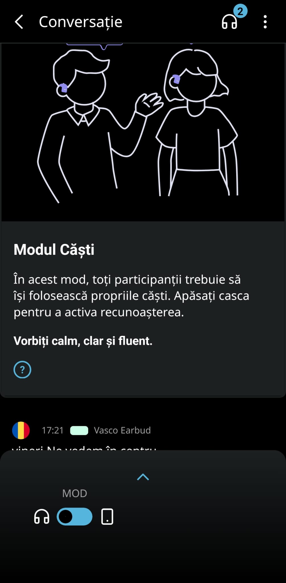 1. Modul Căști (Earbuds): Atât utilizatorul, cât și interlocutorul lui, trebuie să poarte câte o cască. Căștile detectează automat limba vorbită și traduc în timp real, fără a fi necesară o acțiune manuală. Acest mod este ideal pentru conversații private și discrete.