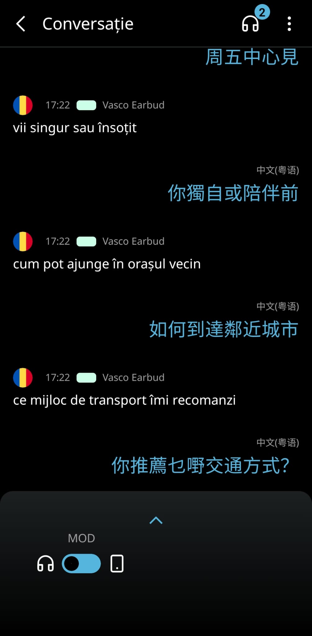 3. Începeți Conversația: Așezăm căștile pe urechea dreaptă și începem să vorbim, traducerea se va realiza automat în timp real.